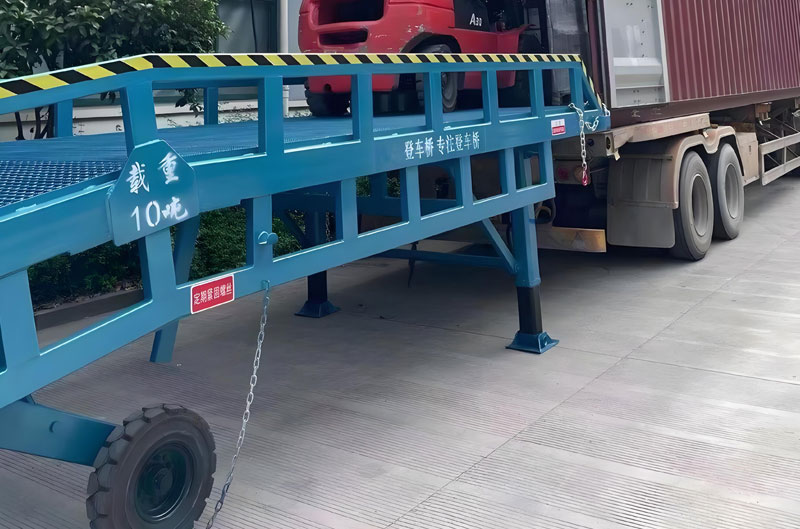 1、調節移動式登車橋高度,使移動式登車橋的唇板和貨車車廂搭接。